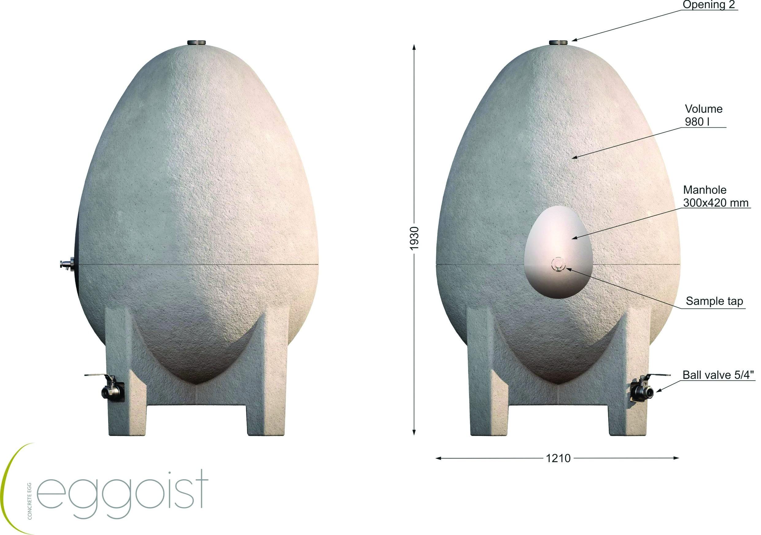Betonsko jajce Eggoist je posebej ustvarjeno za zahtevnega pridelovalca vina. Sleherno jajce je izdelano ročno in je 100-odstotno slovenski proizvod in plod lastnega razvoja. Visokotehnološki naravni beton najprej ulijejo v kalup, kjer se po 24 urah jajce razkalupi in postavi odlitek v posebno komoro za nego betona, kjer se beton neguje 45 dni. Nato se začne finalna obdelava zunanjosti jajca, montaža inoks izpustov, vgradnja poskusne pipice … Vratca so v notranjosti in zunanjosti poravnana z notranjo silhueto jajca. S tem dosežejo, da je jajce brez ostrih robov, oblika ni prekinjena, kar omogoča naravno gravitacijo vrtinčenja vina v notranjosti jajca. Na koncu testirajo še vodotesnost in obdelajo notranjost jajca z vinsko kislino in pripravo za končnega kupca. Višina jajca znaša malo manj kot dva metra, je volumna 980 litrov, debelina stene po celotnem obodu je 7 centimetrov, teža pa se zaustavi pri 1200 kilogramih.