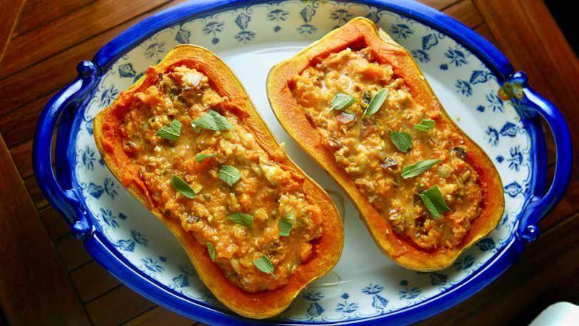 Ko je buča pečena, izdolbi njeno meso, tako da pustiš približno en centimeter roba. Meso pretlači in ga dodaj mešanici orehov, pancete in sira. Maso naloži v izdolbeno bučo, dodaj natrgan žajbelj in vse skupaj še za četrt ure vrni v pečico.