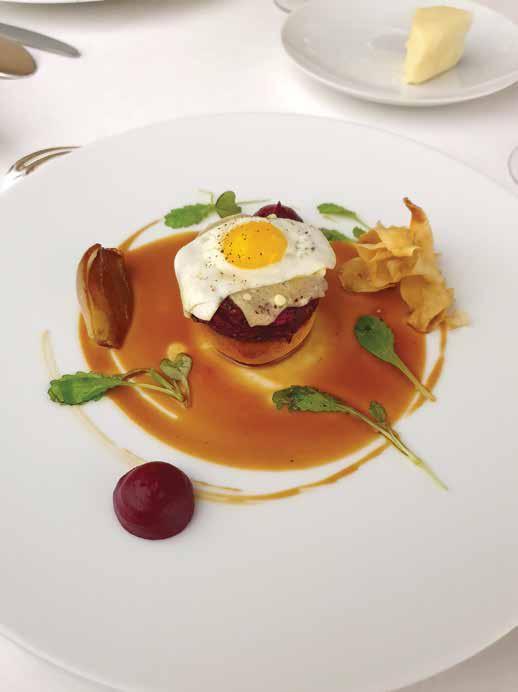 Morda zato, ker je prišel ravno po tej specialiteti, se mi je izmed vseh krožnikov še najmanj zanimiv zdel tartar kuhane rdeče pese s prepeličjim jajcem, položen na rezino brioša in oblit s temno omako. Videti je bil sicer super lepo in bil tudi zelo okusen, vendar v primerjavi z drugimi jedmi, kljub sladkasti šalotki in čipsu gomoljne zelenjave, nekako bled. Ne glede na to pa si bom ta hod zapomnila za celo življenje, saj je ravno v tem času k mizi z vsem svojim entuziazmom pristopil gospod Alain. Potem ko je izvedel, da sem iz Slovenije, je povedal, da tu še ni bil in smeje vprašal, ali mu bom kaj skuhala, če pride. Vem, da se je šalil, ampak, če bi vedel, kako dobro kuham … Po nekajminutnem pogovoru, s katerim se je izpolnila še ena moja rojstnodnevna želja, sva posnela nekaj fotografij in moram priznati, da mu gre tudi poziranje zelo dobro od rok.